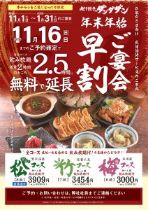 期間中に対象のコースをご予約いただいたお客様には、飲み放題を30分延長してご提供いたします。